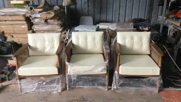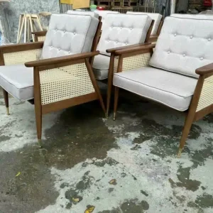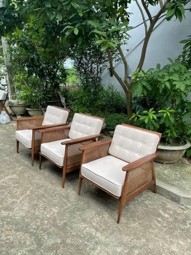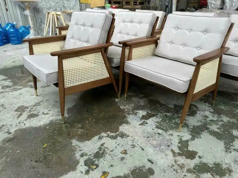 - Chất liệu: Gỗ Tần bì kết hợp đan mây, mặt ngồi gỗ, bọc nệm nỉ hoặc da simili tùy chọn