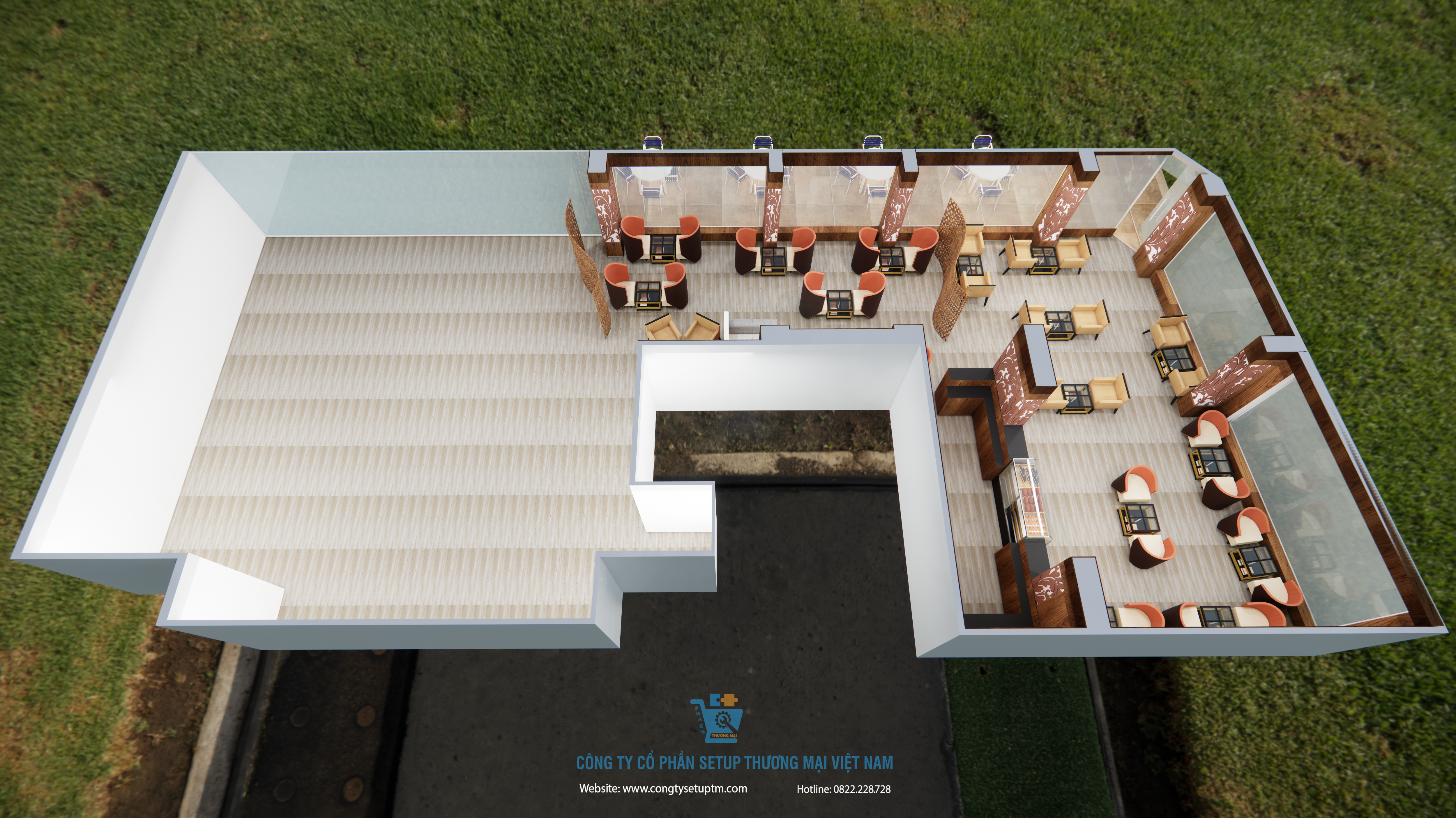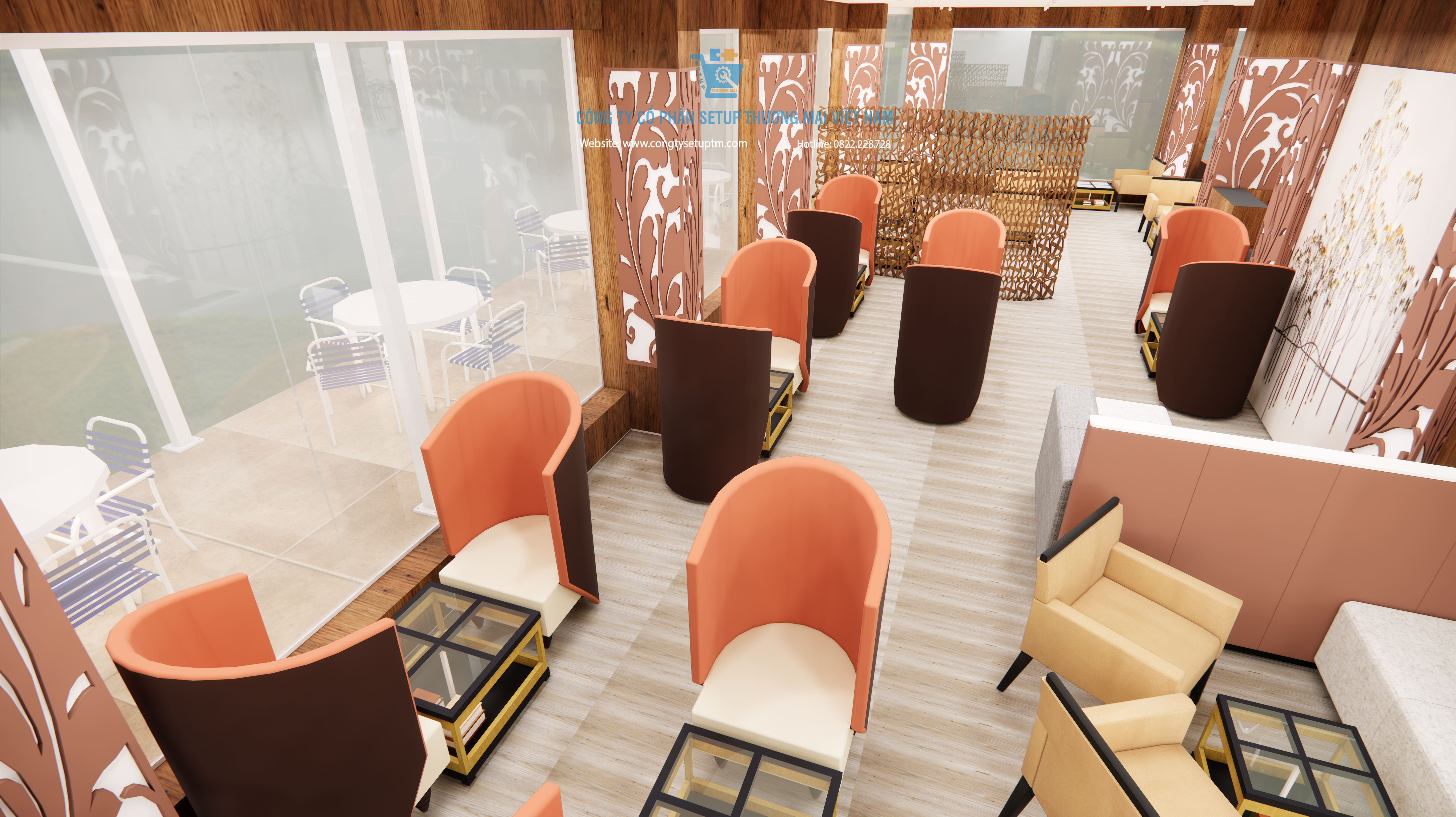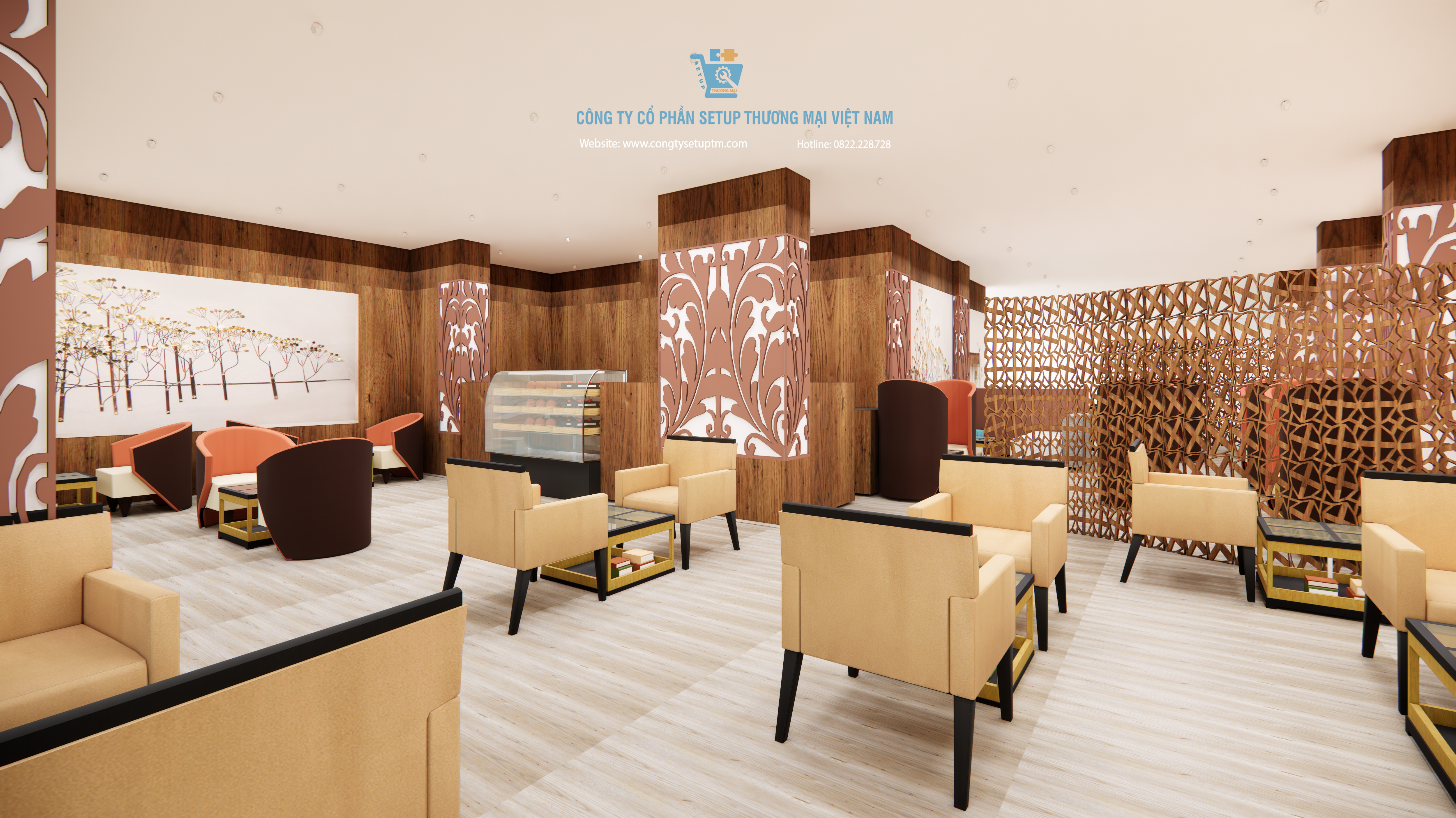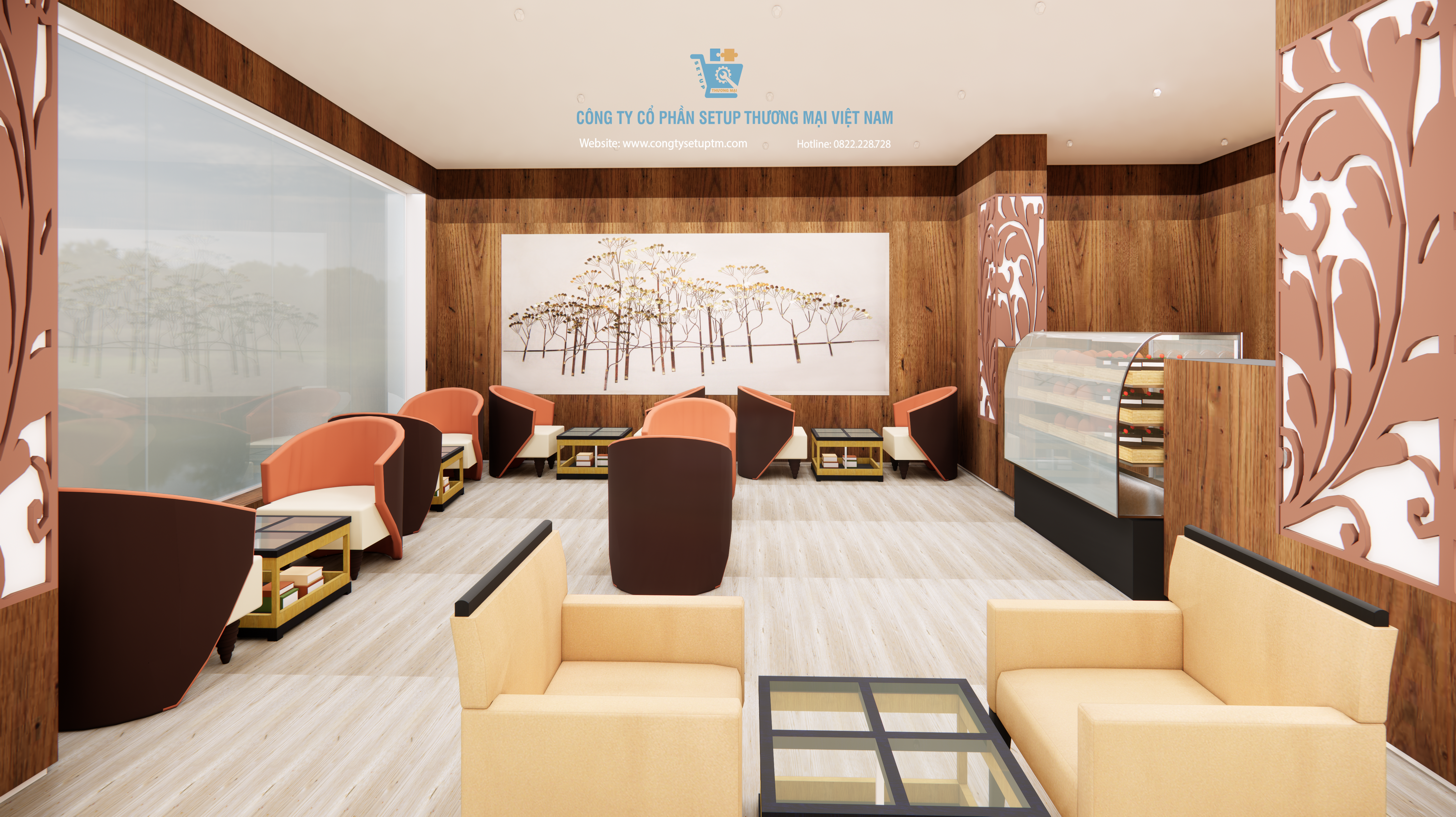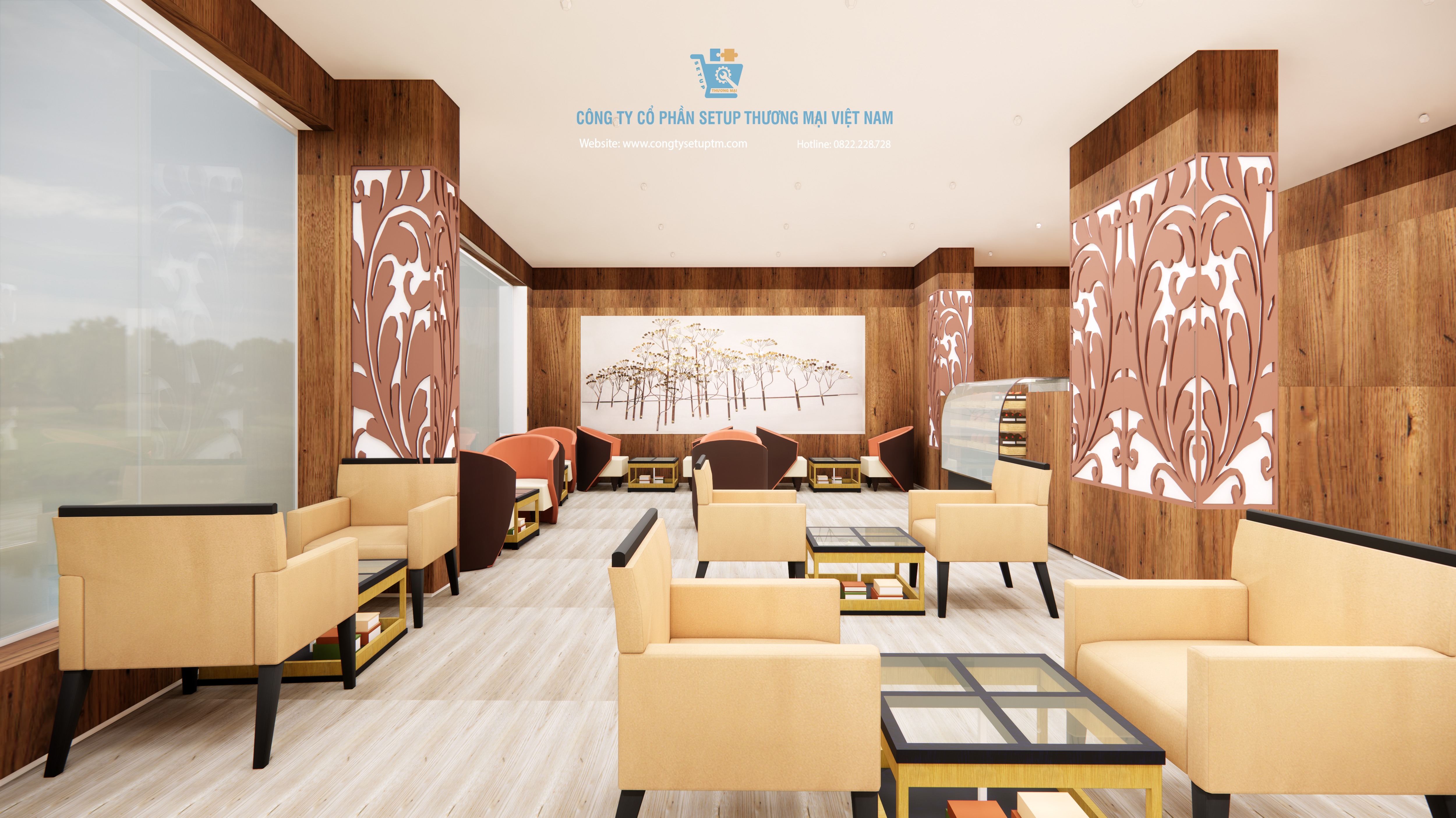 Hiểu được điều đó, Công ty Cổ phần Setup Thương Mại Việt Nam hân hạnh giới thiệu mẫu thiết kế quán cà phê hiện đại, sang trọng, kết hợp hài hòa giữa yếu tố thiên nhiên và kiến trúc đương đại. Đây không chỉ là một bản vẽ 3D, mà là một chiến lược kinh doanh không gian bài bản.