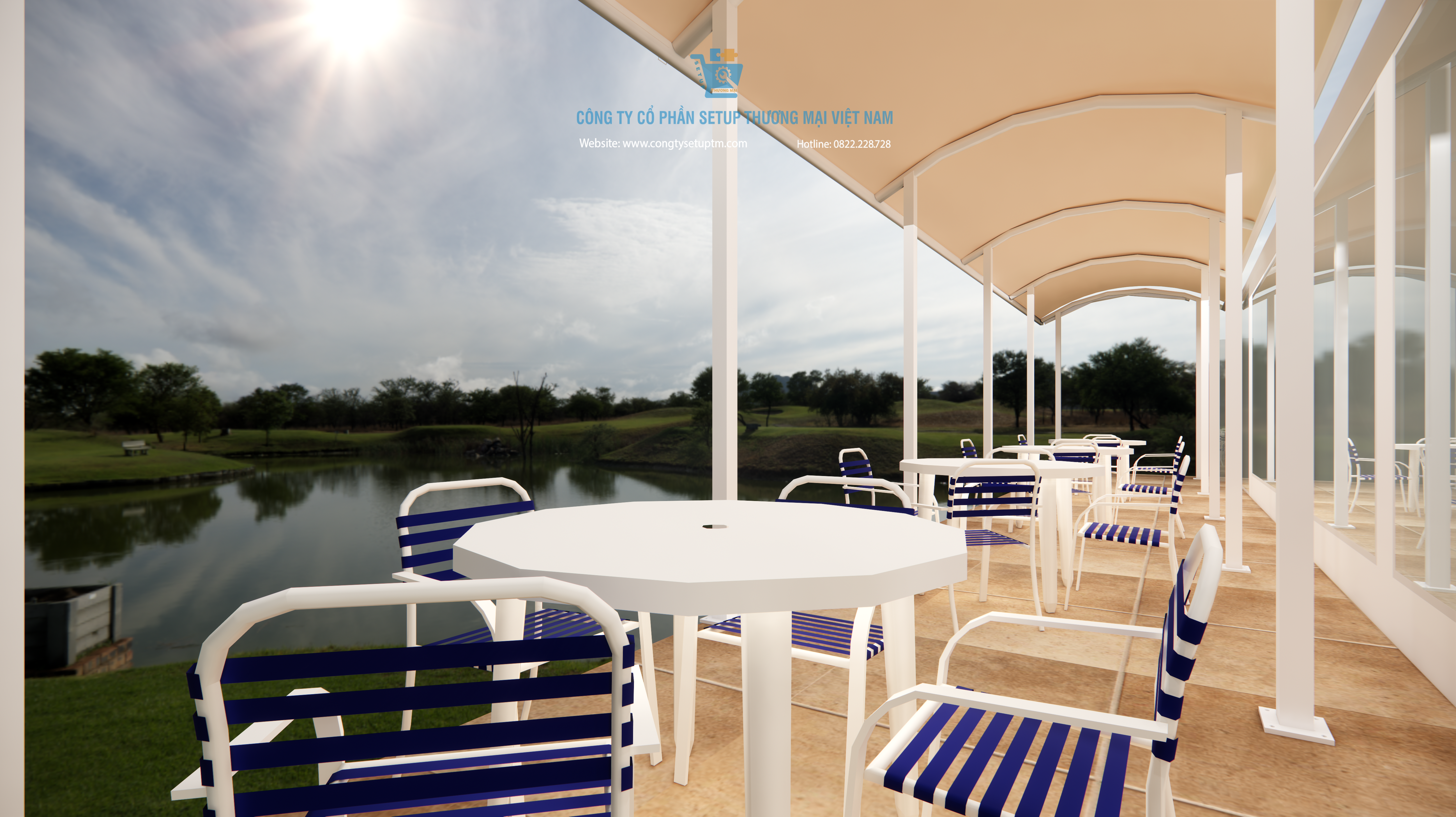 Khu vực ngoài trời được trang bị hệ thống mái che cánh buồm màu kem hiện đại. Với bộ bàn ghế tone Trắng – Xanh thanh lịch, đây là nơi lý tưởng cho những khách hàng yêu thích không khí tự nhiên hoặc có thói quen hút thuốc. View nhìn thẳng ra hồ nước chính là “vũ khí” marketing hiệu quả nhất để khách hàng check-in và quảng bá quán miễn phí trên mạng xã hội.