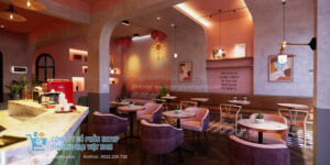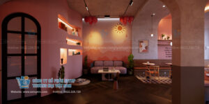 Màu hồng Terracotta & Pastel: Chiếm trọn trần và một phần tường, tạo cảm giác ấm áp, thân thiện và cực kỳ “trendy”.
