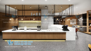 Chất liệu: Sự kết hợp giữa mặt đá trắng và phần thân quầy ốp nan gỗ dọc (lam gỗ) tạo nên sự tương phản thú vị. Những đường nan gỗ đều tăm tắp không chỉ mang lại hiệu ứng thị giác về chiều cao mà còn tạo cảm giác ấm cúng, gần gũi.