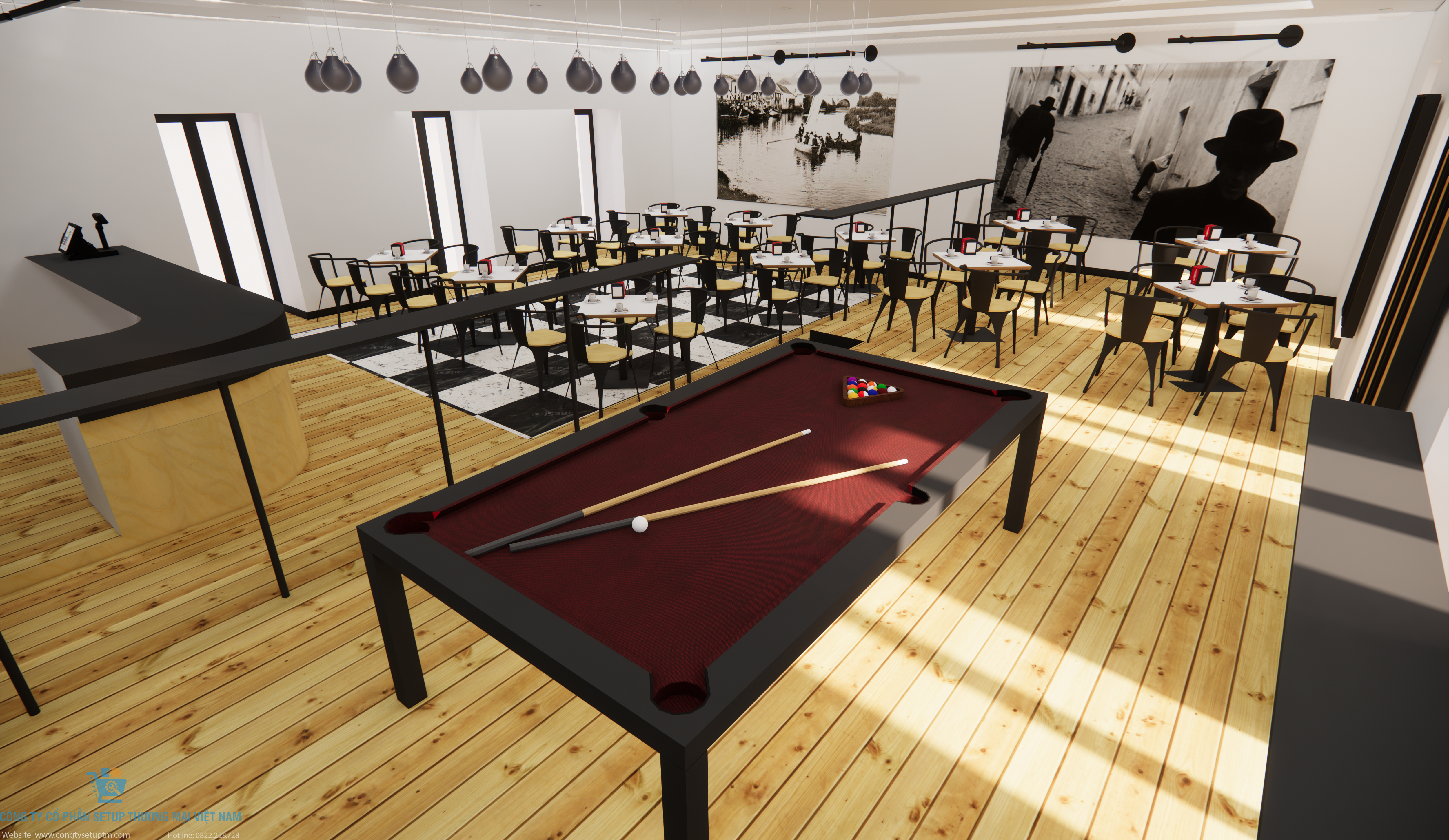 Một chiếc bàn Billiards được đặt ở vị trí trung tâm trên sàn gỗ là minh chứng cho tư duy thiết kế đa năng. Đây không chỉ là một quán cà phê để làm việc, mà còn là không gian giao lưu, giải trí cho những nhóm khách hàng hiện đại.